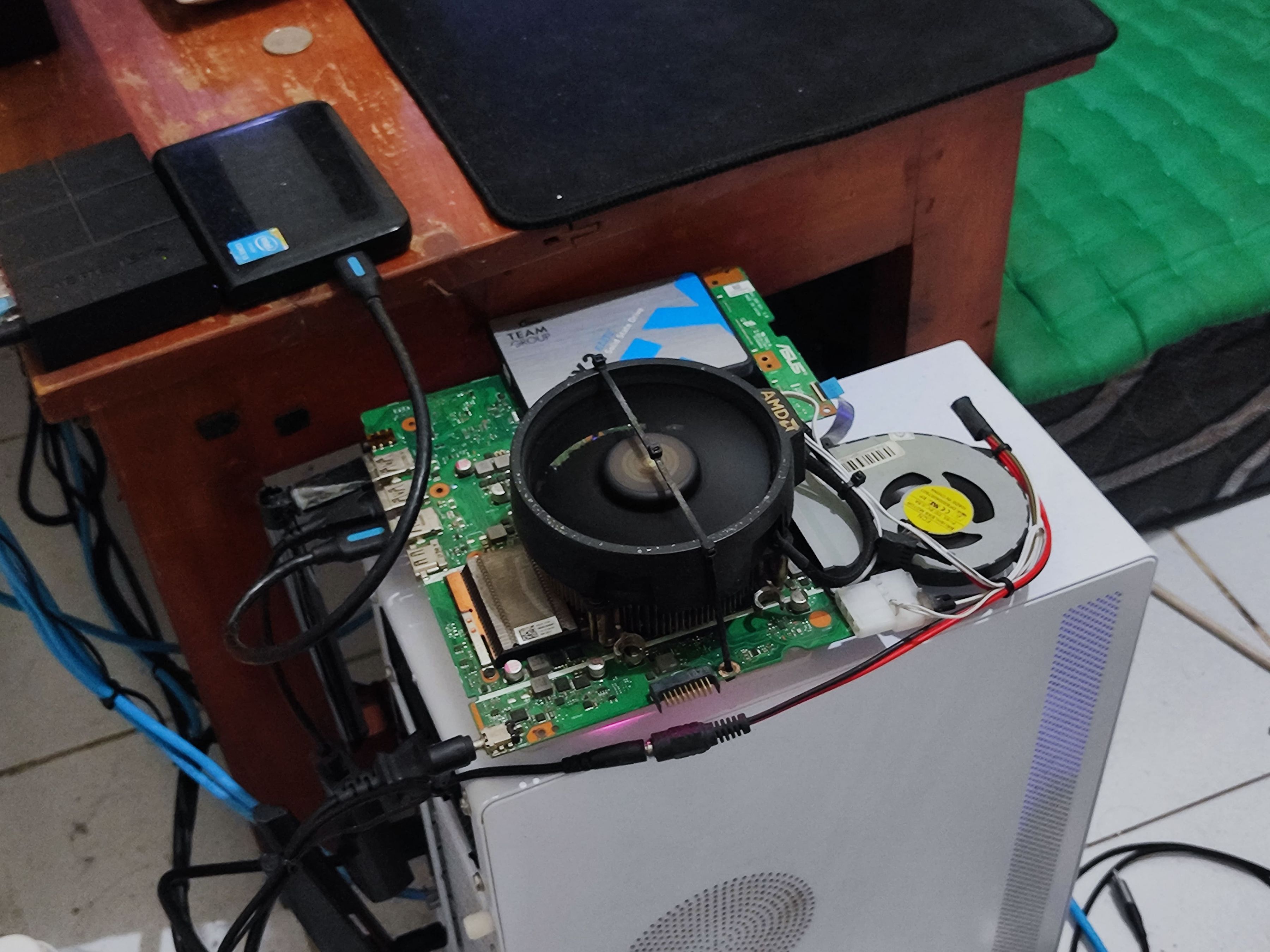 For this build, I repurposed the motherboard from my old ASUS laptop that was no longer in use. To improve thermal performance, I modified the cooling system by mounting an AMD stock heatsink on top of the laptop's original heatsink. The specifications include an Intel Core i5-8250U processor, 8GB of RAM, and a 512GB SSD.
